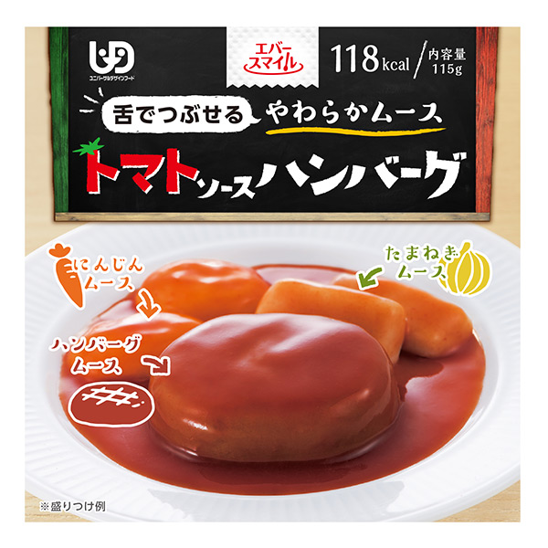 見た目の彩りとそれぞれの素材が持つ風味を楽しむことできる新しいムース食です。調味液(あん)とムースを和えながらつぶすことでお好みのやわらかさに変えることが出来ます。ムースは舌でつぶせるやわらかさ(ユニバーサルデザインフードに準拠)としております。